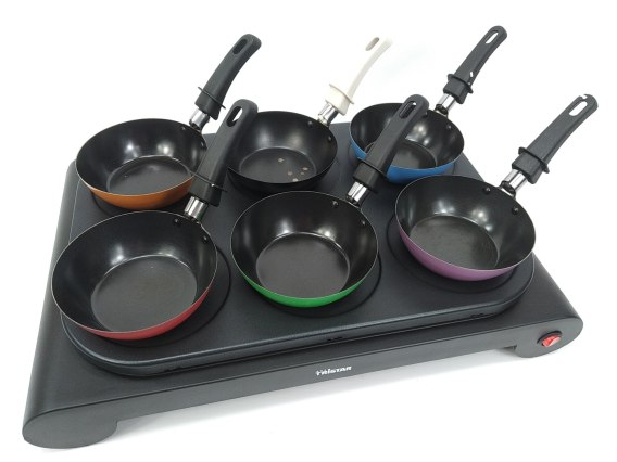 Kuchenka elektryczna z wokami TRISTAR model BP-2827. Idealny zestaw dla całej rodziny lub grupy przyjaciół. Sześć kolorowych woków, daje swobodę przygotowania naraz mięsa, ryb i warzyw. Wszystkie mini woki posiadają powłokę zapobiegającą przywieraniu.